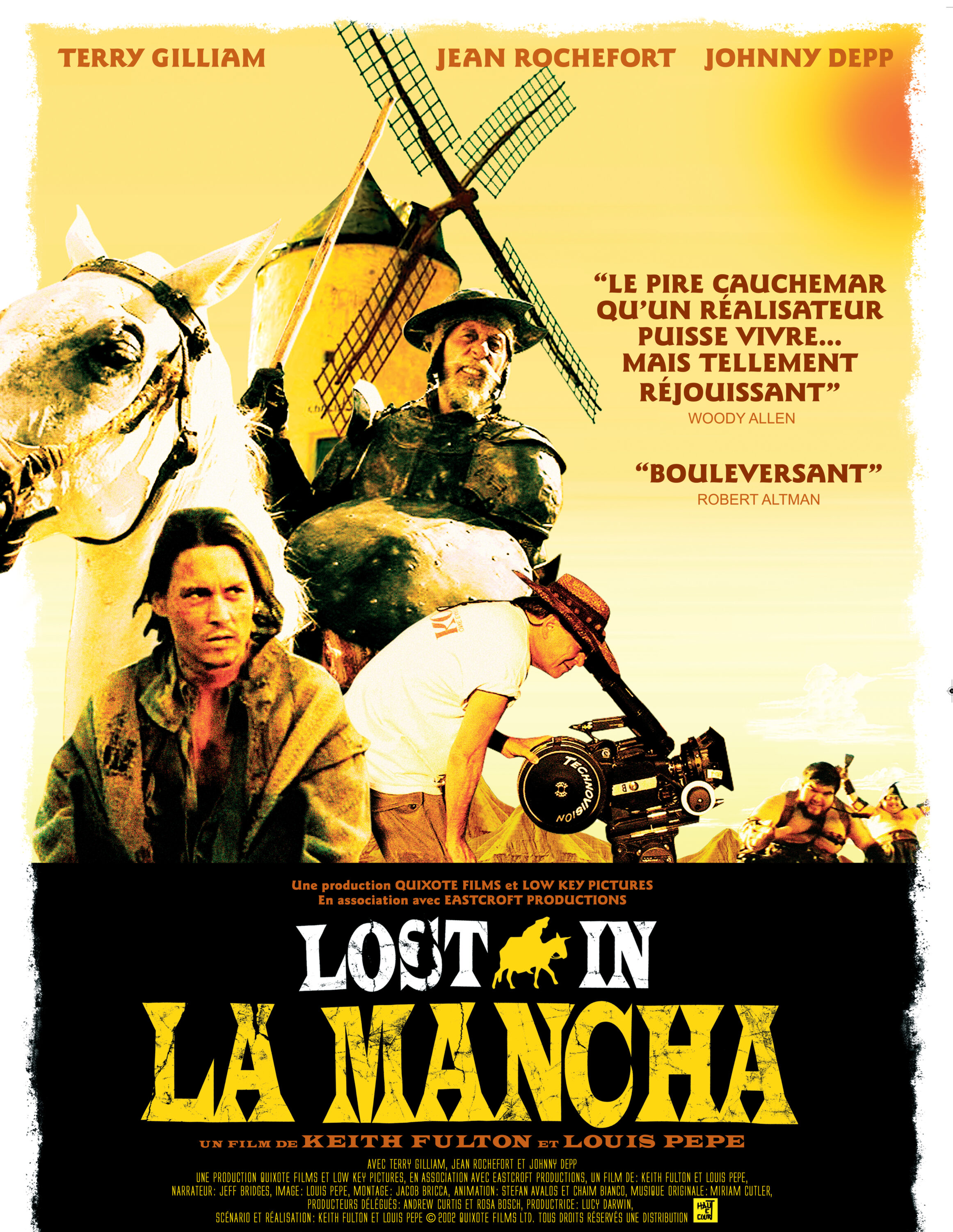 Le cinéaste TERRY GILLIAM se mesure à son alter ego, DON QUICHOTTE, dans ce documentaire sur la « non-réalisation » d’une superproduction LOST IN LA MANCHA est probablement le premier film documentaire sur la « non-réalisation » d’un film: au lieu de présenter un aperçu édulcoré des coulisses du tournage, LOST IN LA MANCHA aborde de manière inédite la dure réalité de la réalisation. Témoin de conflits personnels comme de tempêtes mémorables, c’est un document unique sur le naufrage d’un film. Madrid, été 2000: Terry Gilliam, cinéaste visionnaire, se prépare à tourner L’HOMME QUI TUA DON QUICHOTTE, une version très personnelle de l’œuvre de Miguel de Cervantès, avec Jean Rochefort, Johnny Depp et Vanessa Paradis dans les rôles principaux. Malgré des conditions de production chaotiques, GILLIAM reste très enthousiaste. Après dix ans de combat acharné, il est sur le point de réaliser son rêve. En rejoignant l’équipe de production, basée à Madrid, huit semaines avant le début du tournage, les réalisateurs de LOST IN LA MANCHA, Keith Fulton et Louis Pepe ne savent pas encore ce qui les attend. Pourtant, les problèmes ne tardent pas à arriver: les membres de l’équipe, multilingue, rencontrent des difficultés à exprimer leurs idées ; les acteurs, ayant pris du retard sur leurs autres projets, se font désirer ; et d’autres impondérables tels que des chevaux mal dressés et un plateau mal insonorisé compromettent déjà le tournage. Toutefois, on ressent un enthousiasme palpable et grandissant car le projet de GILLIAM va enfin se concrétiser: l’équipe visionne les bouts d’essais des géants maraudeurs, les marionnettistes s’entraînent à manipuler une armée de pantins grandeur nature, GILLIAM et Johnny Depp peaufinent le scénario. Et lorsque Jean Rochefort enfile l’armure de Don Quichotte, tout semble aller pour le mieux, a priori. Mais le tournage à peine commencé, les catastrophes s’enchaînent…